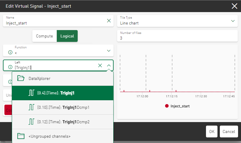 The number of input and parameter input fields displayed in the dialog changes according to the selected function group. In the respective input fields, you can access the signal tree of the stored datasource via a drop-down menu. Tap on a name in the signal tree and select a specific value for the respective parameter field of the virtual signal. Depending on the selection, several values can also be selected.