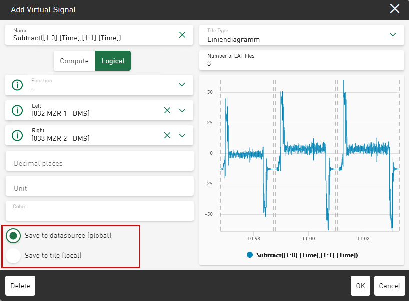 In the preview area, the currently determined result for the virtual signal is displayed in accordance with the current datasource and the selected functions. The virtual signal is displayed in a line chart as a default view.