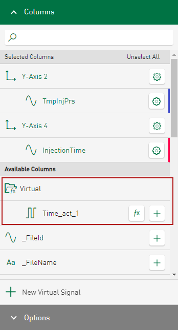 In the configuration view, open the column or signal selection of the tile and tap <New Virtual Signal>.