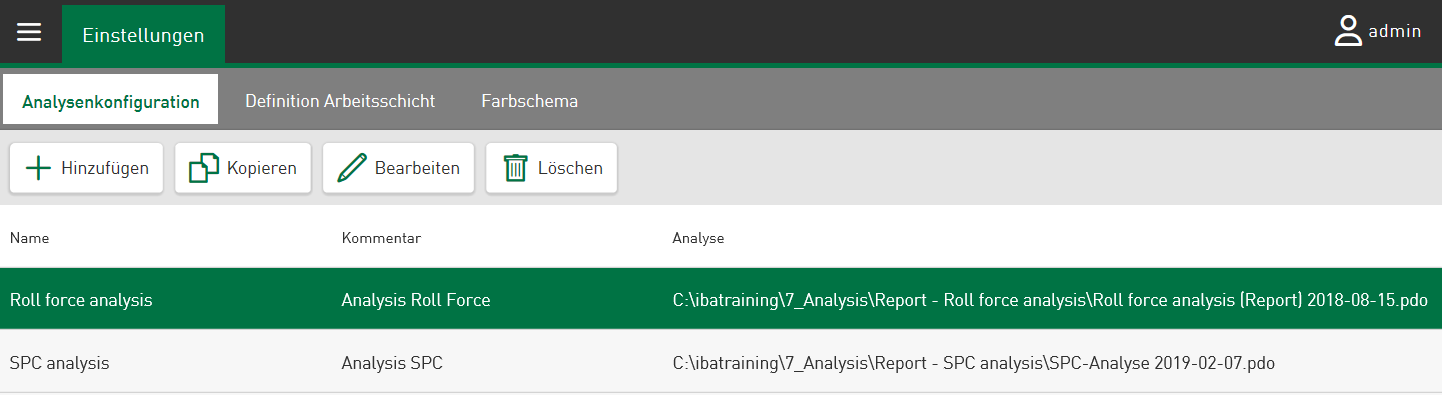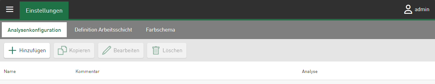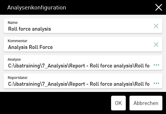 Die Analyse wird in der Liste der Analysenkonfiguration angezeigt und kann mit einer Datenquelle verknüpft werden, siehe Register Analyse. Die aktuellen Einstellungen werden dann direkt im Projekt gespeichert.