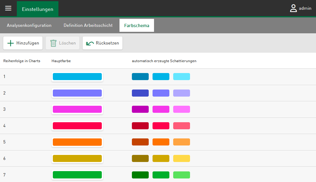 Sie können die Position der Farben in der Liste und damit der Rang der Farben im Diagramm per Drag & Drop verändern. Der Rang der Farbe entspricht der Reihenfolge der Farben, die automatisch zugeordnet werden, wenn Sie neue Signale oder Werte in Kacheln hinzufügen.