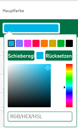 Es sind 8 verschiedene Hauptfarben vorgegeben. Sie können jede Farbe individuell anpassen, wenn Sie auf das jeweilige Farbfeld tippen. Das erscheinende Bearbeitungsfenster bietet neben den Hauptfarben auch eine interaktive Farbauswahl über den <Schieberegler> und ein Texteingabefeld zur Definition der Farbe mittels RGB-Wert, HEX-Code oder HSL-Farbcode an.