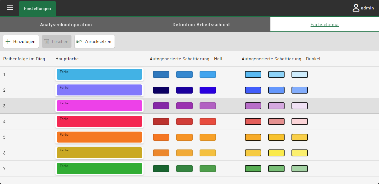 Pro Hauptfarbe können Sie bis zu 2 Autogenerierte Schattierungen jeweils für den Ansichtsmodus "Hell" und "Dunkel" nutzen. Diese werden von den Hauptfarben abgeleitet, um beispielsweise mehrere Signale mit gleicher Einheit in der Kachelansicht voneinander zu unterscheiden.