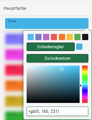 Es sind 7 verschiedene Hauptfarben vorgegeben. Sie können jede Farbe individuell anpassen, wenn Sie auf das jeweilige Farbfeld tippen. Das erscheinende Bearbeitungsfenster bietet neben den Hauptfarben auch eine interaktive Farbauswahl über den <Schieberegler> und ein Texteingabefeld zur Definition der Farbe mittels RGB-Wert, HEX-Code oder HSL-Farbcode an.