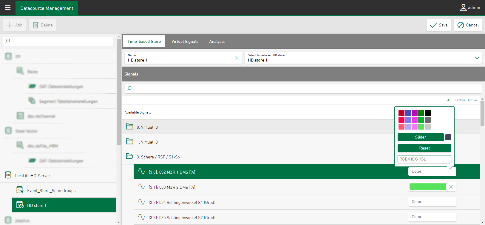 Under Datasource Management, you can define a color for a signal, a value or a virtual signal for display in the tiles. The color is then used for this signal on all tiles and dashboards. The color definition at this point increases the recognition effect of individual signals and saves the individual color configuration in the individual tiles on every dashboard.