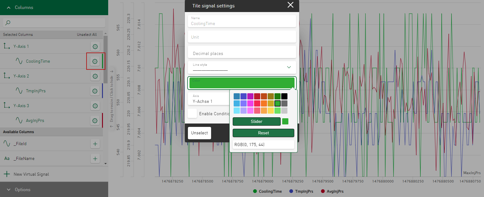 A color selection field is assigned to each selected column/signal via the properties window of the signal settings or in the Options section of the respective tile type.
