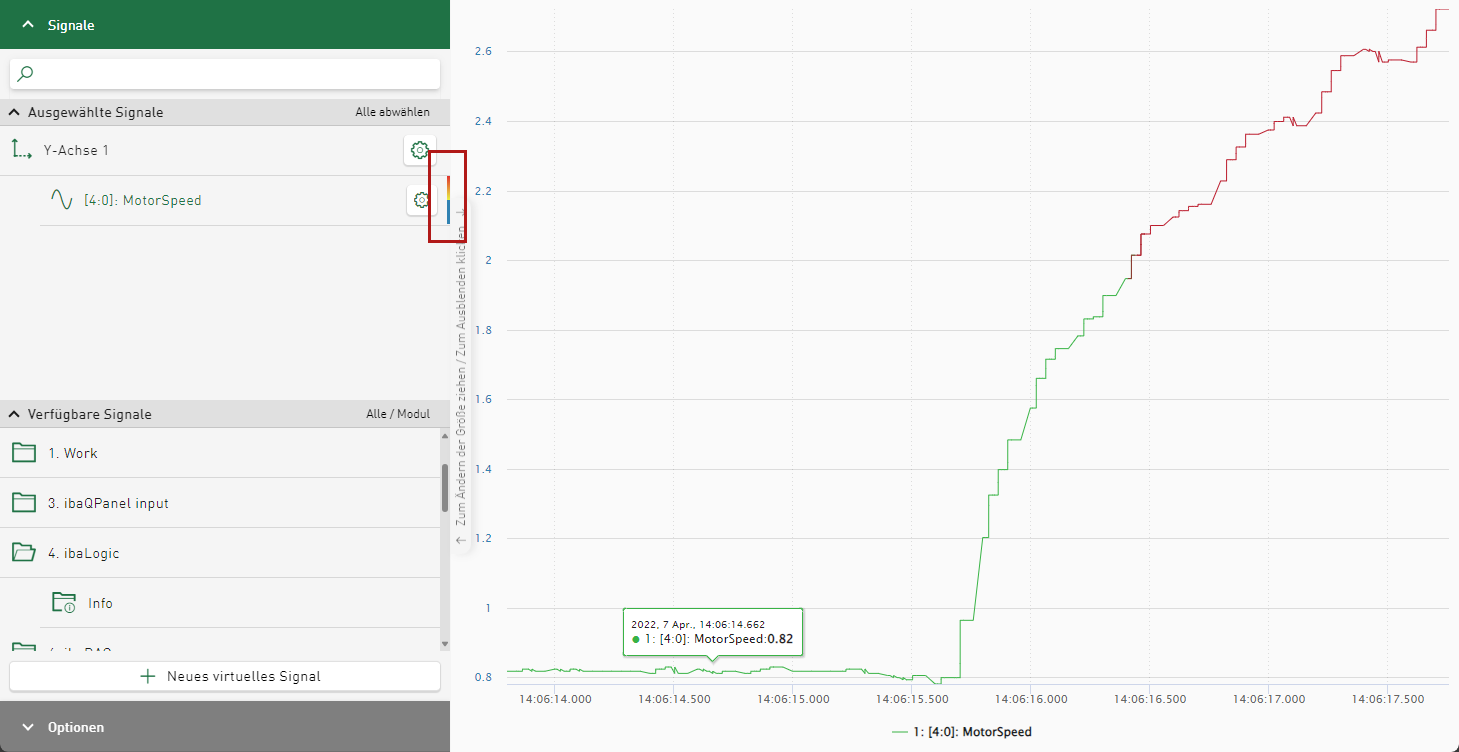 Sie können Signalverläufe und Werte basierend auf definierten Bedingungen in unterschiedlichen Farben darstellen. So können Sie z. B. Grenzwertüberschreitungen oder bestimmte Zustände visuell hervorheben. Die Konfiguration bedingter Farben steht Ihnen für Signalverläufe in Liniendiagrammen, Signalpunkte in XY-Diagrammen, Werte in Tabellen und der Werteanzeige zur Verfügung. Als Bedingung sind Wertebereiche, ein anderes Signal oder ein spezifischer Wert eines Text- oder Digitalsignals möglich.