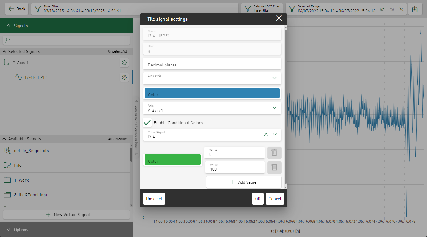 If the conditional coloring is to be determined by a different signal, select this in the Color Signal field.