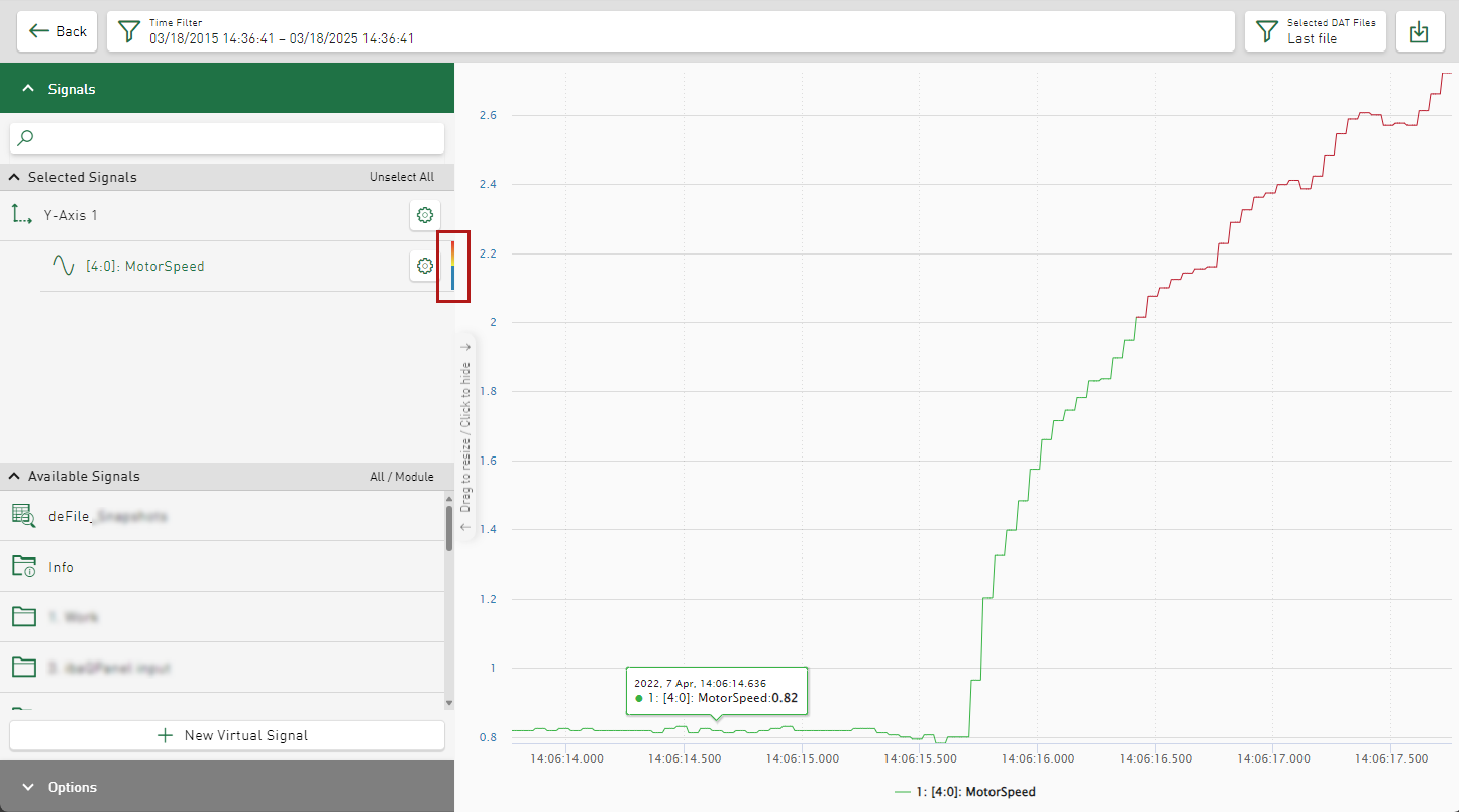 You can display signal curves and values in different colors based on defined conditions. This allows you to visually highlight limit violations or certain conditions, for example. Conditional color configuration is available for signal curves in line charts, signal points in scatter charts, values in tables, and the value display. Value ranges, another signal or a specific value of a text or digital signal are possible as conditions.