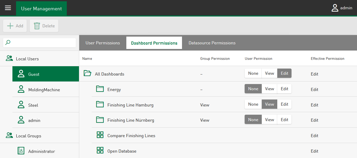 After opening the tab, a dashboard tree is displayed and the admin user can set the access permissions for each directory (folder/dashboard) to <None>, <View> or <Edit> per selected user or user group. The selected permission is inherited from the higher to the lower directory level. The set dashboard access permissions always relate to the currently selected user or user group.