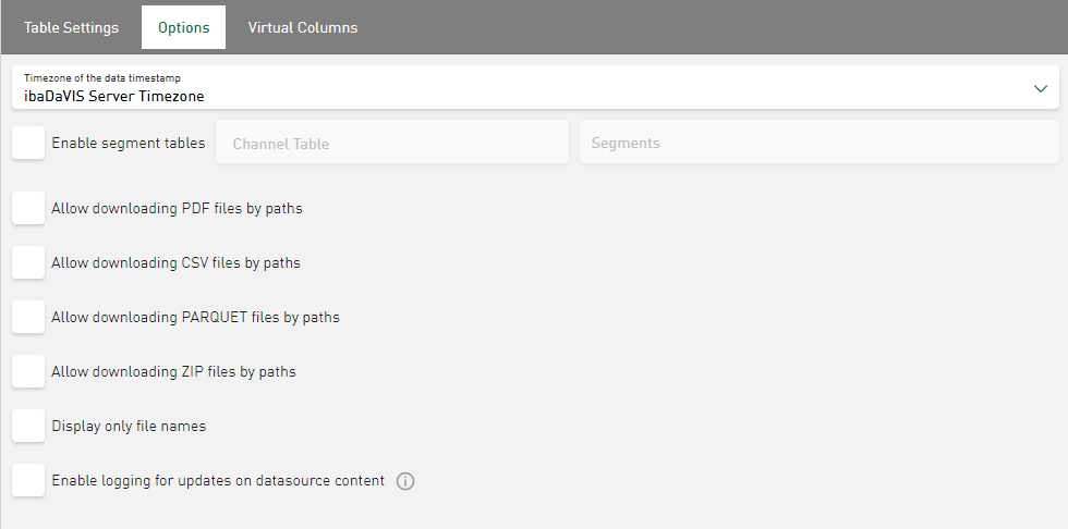 In addition to the table settings, the following options are available for datasources of type iba File Table and General Table.