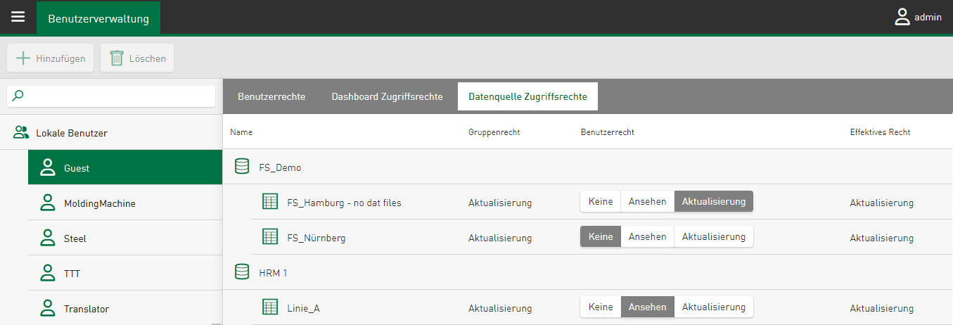 Die konfigurierten Datenquellen werden in einer Übersicht angezeigt, und die Berechtigung zur Bearbeitung von Daten aus diesen Datenquellen kann hier vergeben werden. Die Funktion <Ansehen> erlaubt nur die Anzeige dieser Daten.