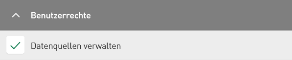 Um Inhalte von Datenquellen bearbeiten zu können, muss den Benutzern zuerst die Berechtigung zur Verwaltung von Datenquellen unter Benutzerrecht oder Gruppenrecht als individuelles Recht zugewiesen werden, siehe Benutzer – Register Benutzerrechte. Dazu gehört automatisch auch die Berechtigung, Daten aus den konfigurierten Datenquellen anzusehen.