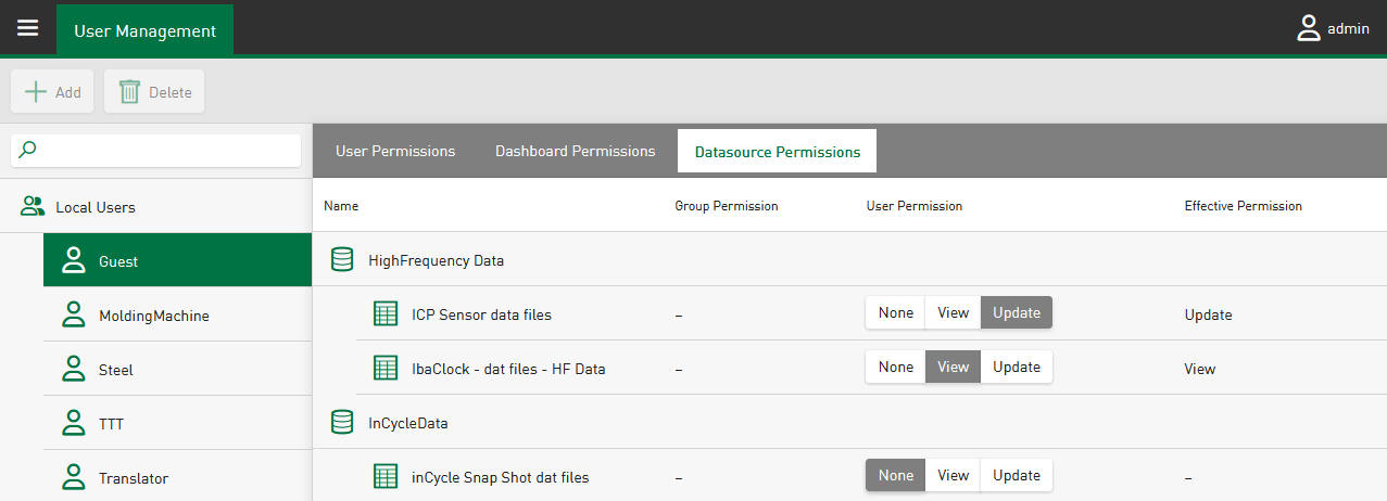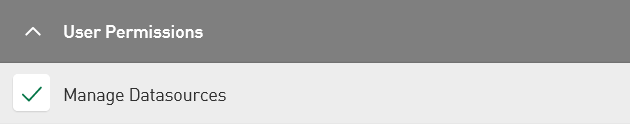 In order to be able to edit the content of datasources, users must first be assigned the authorization to manage datasources under User Permissions or Group Permissions as individual permission, see User – User Permissions tab. This automatically includes the authorization to view data from the configured datasources.