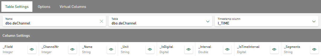 The default is the column name "I_TIME". All database tables that contain a date/time column are permitted as a General Table. The currently available columns and a reduced data set are visualized as a preview.