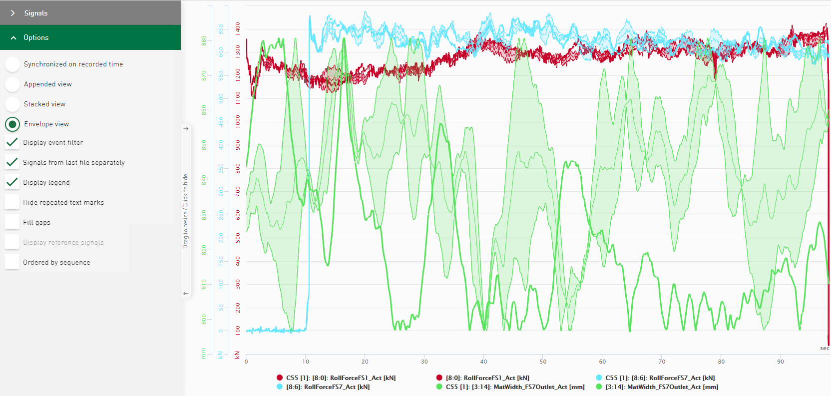 In the example, the DAT file filter is set in an envelope view so that signals from the last 3 files are visualized. The signals from two previously calculated DAT files are displayed unchanged, but the signals from the last DAT file determined are clearly highlighted.