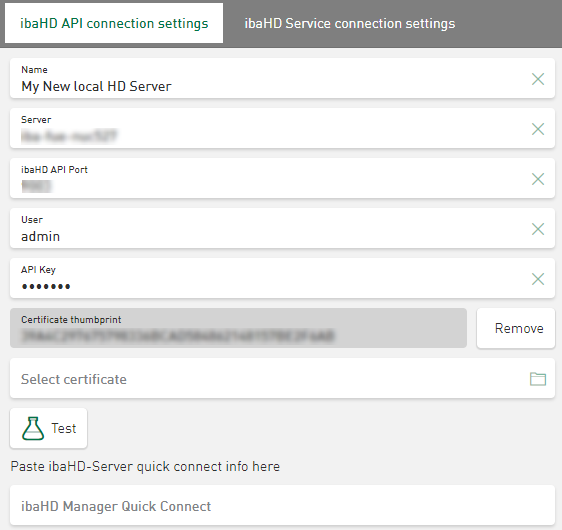 Both the API Key and the Certificate thumbprint are already provided in the ibaHD Manager user interface and transferred directly to read-only fields. Enter the further connection parameters directly in this view of ibaDaVIS.