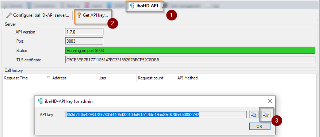 The ibaHD-API key for admin dialog opens.