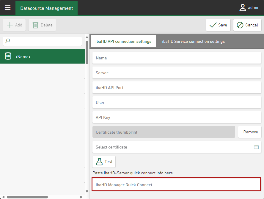 Insert the connection information as a string in the ibaHD Manager Quick Connect input field.