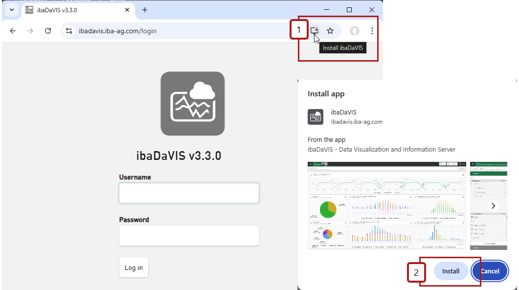 In the following you will learn how to install ibaDaVIS as progressive web app (PWA). Depending on the browser or end device, different installation options are possible.
