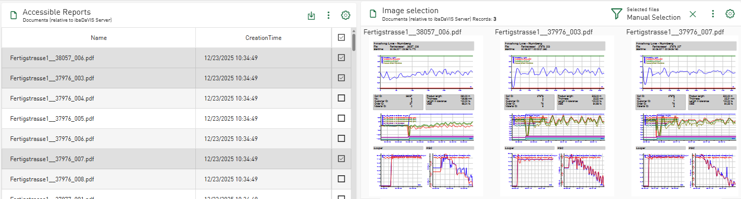 Wenn Sie als Datenquelle für die Tabelle Dokumente (relativ zu ibaDaVIS-Server) gewählt haben, können Sie eine oder mehrere Zeilen in de Tabelle markieren, um die entsprechenden Dateiinhalte auf der Dokumentanzeige zu visualisieren.