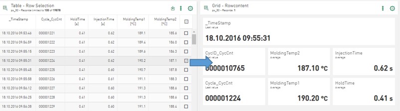 Durch Auswahl einer Zeile im Kacheltyp Tabelle kann der zugehörige Inhalt in allen Zellen des Kacheltyps Werteanzeige dargestellt werden, die den Inhalt derselben Datenquelle anzeigen. Sie können mehrere Zeilen in der Tabelle auswählen.