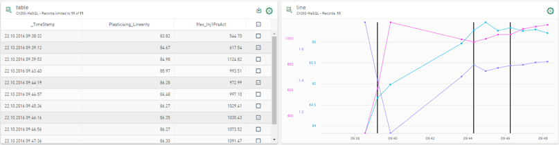 Die Auswahl einer Tabellenzeile nimmt den Zeitstempel der ausgewählten Zeile und setzt eine Markierung auf alle zeitbasierten Diagramme für den ausgewählten Zeitpunkt. Sie können mehrere Zeilen in der Tabelle auswählen.