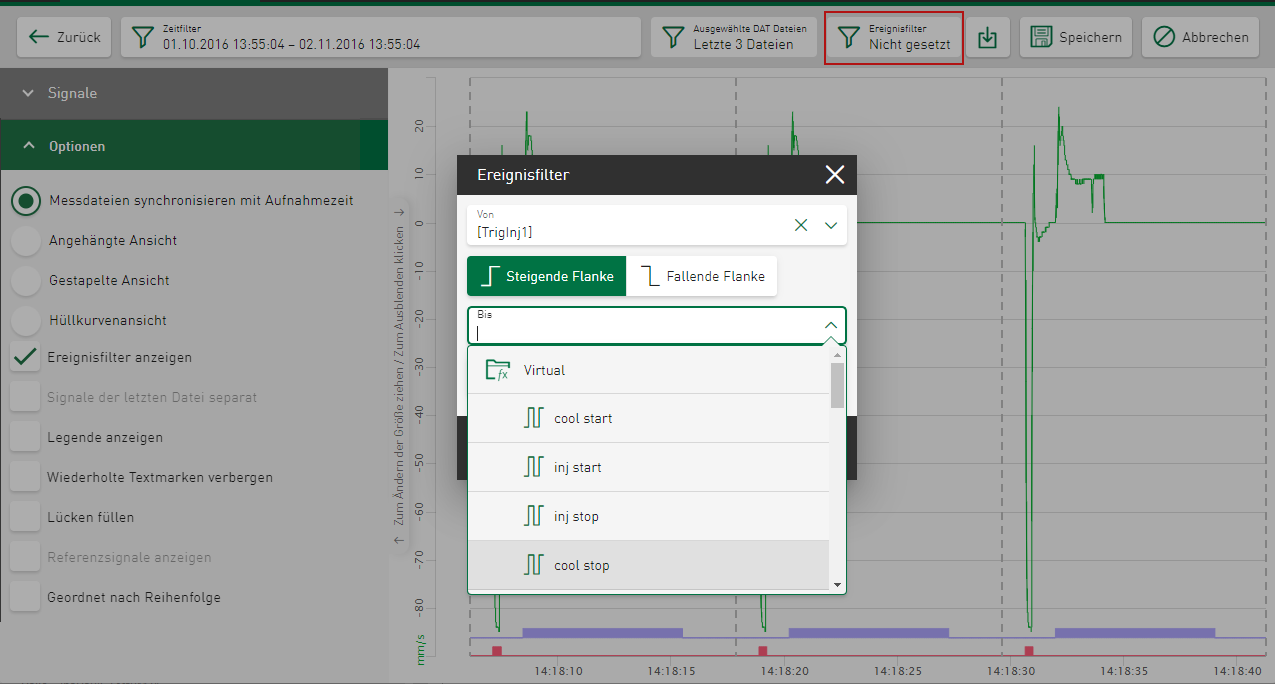 Ereignisse, die in virtuellen Funktionen definiert wurden, können über eine Filterfunktion als Start- oder Stopp-Ereignisse ausgewählt werden. Der visualisierte Bereich, der Signale aus den aktuell ausgewählten DAT-Dateien anzeigt, kann dadurch begrenzt werden.