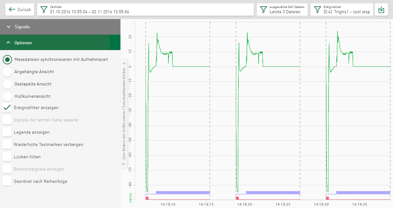 Signale der ausgewählten DAT-Dateien werde nun synchronisiert. Die Signale werden in dem definierten Bereich in der gewählten Ansicht angezeigt, beginnend bei dem ausgewählten Startereignis bis zum ausgewählten Stoppereignis.