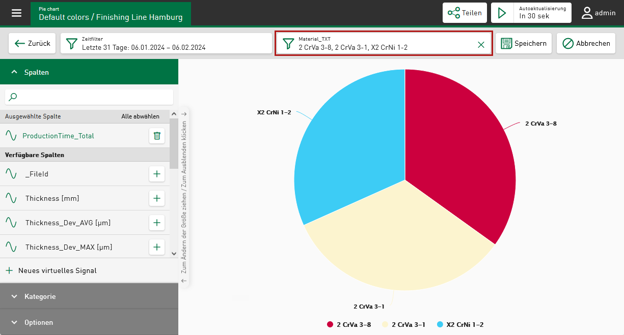 Im Kreisdiagramm können Sie nach den zugrunde liegenden Gruppierungen (Kreissegmenten) filtern.
