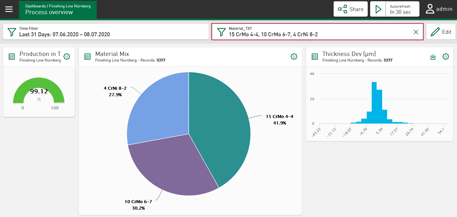 The filtered categories appear in a field above the dashboard. As in the tile view, you can also set the filter by tapping on one or more circle segments (left image below). The pie chart only shows the filtered segments (bottom right image). The display of all tiles changes accordingly. Here too, you can use the filter icon to open a dialog to adjust the filters.