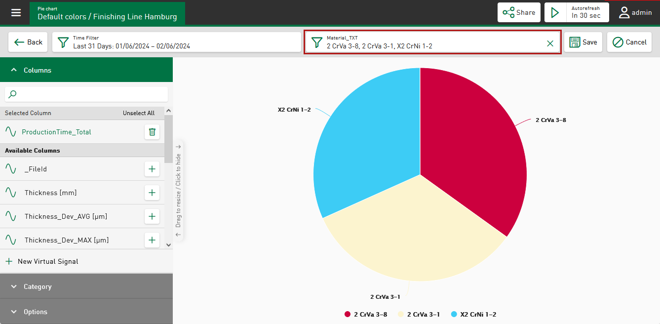 The appearance changes accordingly. The filtered materials appear in a field above the display.