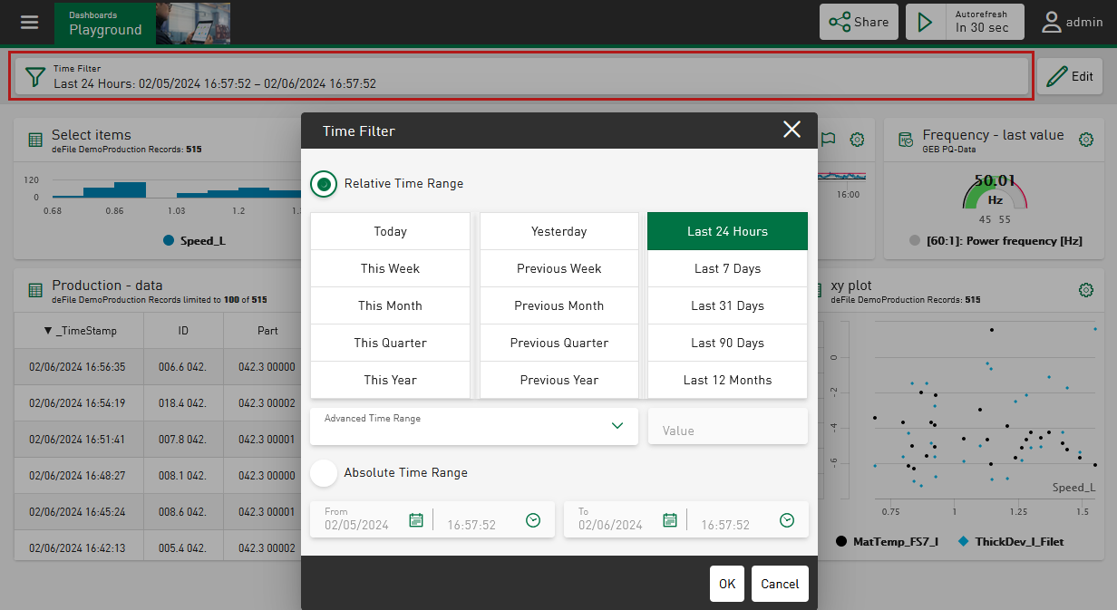 If you have set a work shift filter, you can also set the associated time range as a time filter using the "Last N work shifts - [name]" parameter.