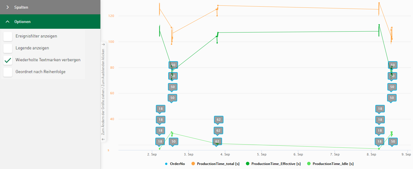 Die Anzahl der angezeigten Beschriftungen ist auf maximal 50 Textbeschriftungen pro ausgewählter Spalte oder Signal festgelegt. Es werden keine Beschriftungen im Diagramm angezeigt, wenn der aktuell angewandte Dashboard-Filter mehr als 50 Werte ausgibt.