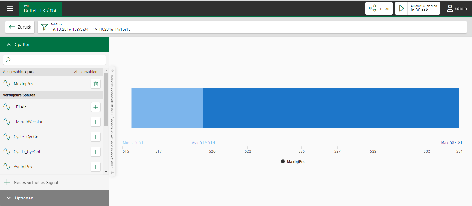 Mit dem Bullet-Graph, oder auch Aufzählungsdiagramm, können mehrere statistische Kenngrößen einer Wertereihe dargestellt werden. Dabei wird aus der gewählten Spalte der Minimum-, Durchschnitts- und Maximumwert sowie der letzte registrierte Wert aus dem aktuell über den Zeitfilter festgelegten Wertebereich abgebildet.