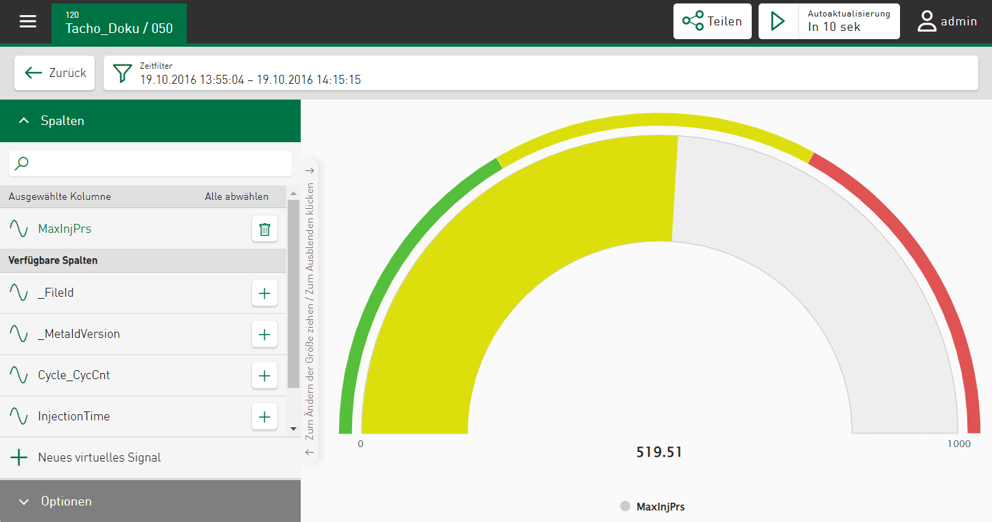 Sie können konstante Werte oder Signale oder auch virtuelle Signale als Minimal- oder Maximalwerte auswählen. Im Tachodiagramm erscheinen die Minimal- und Maximalwerte aller konfigurierten Parameter als Minimum und Maximum des Spektrumbogens, sowie der aktuell berechnete Wert für das ausgewählte Signal.