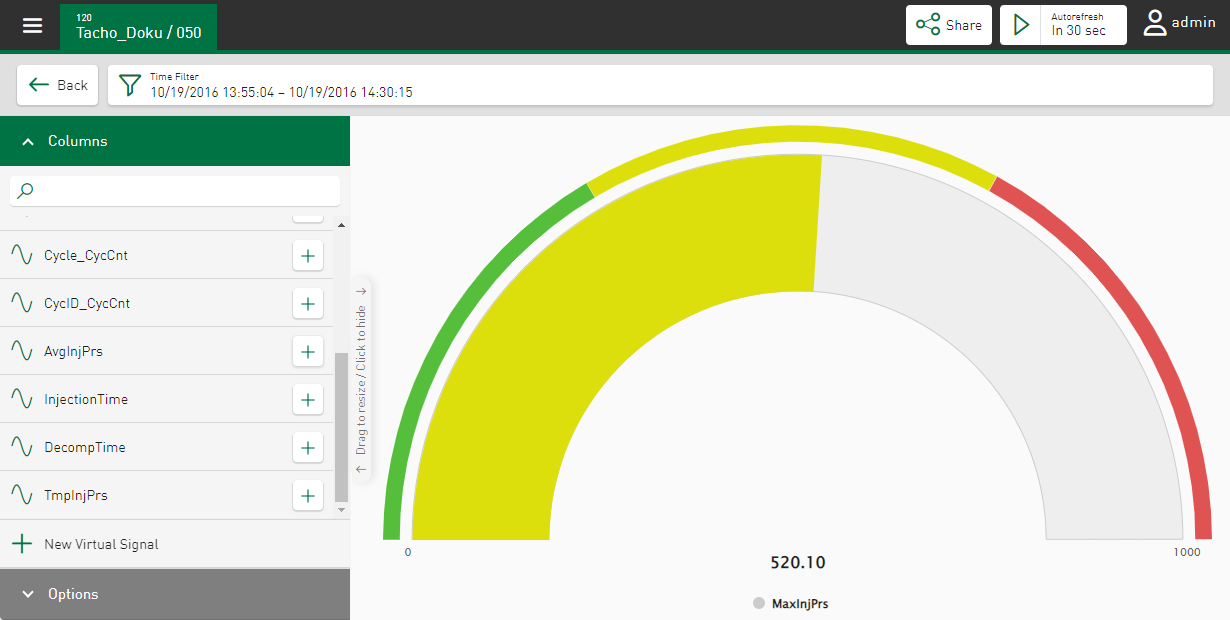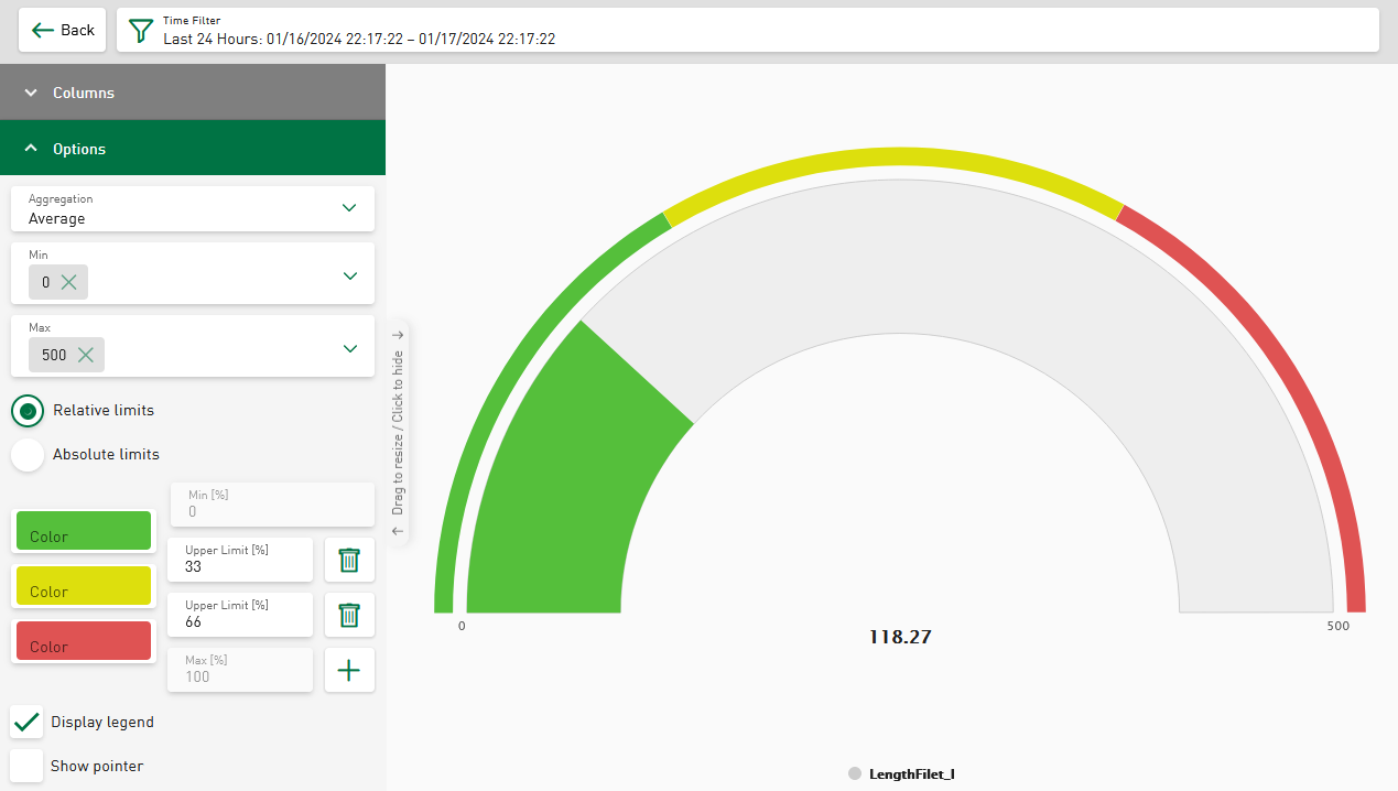 Using the Gauge, you can display individual values. For a select value series, you can use statistical features to calculate and display a value, such as the average value of a parameter over a selected time period. The colored range always starts with the value “0” to make deviations more easily visible.