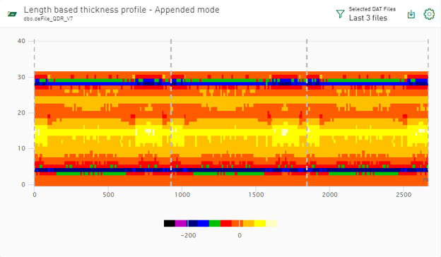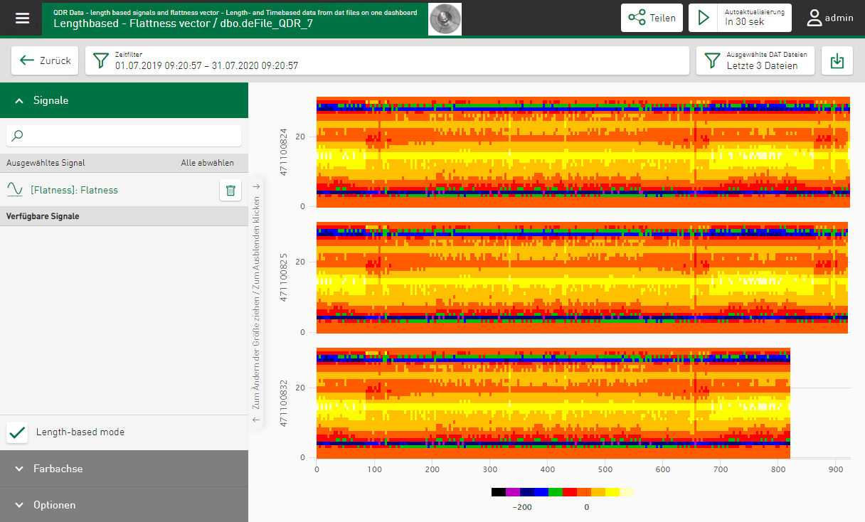 Signale aus DAT-Dateien, die als Vektorgruppe zusammengefasst sind, können Sie als Heatmap visualisieren. Dies ist nützlich für Signale von Planheits- oder Profilinspektionssystemen. Die Heatmap können Sie auf zeitbasierte und längenbasierte Vektoren anwenden.