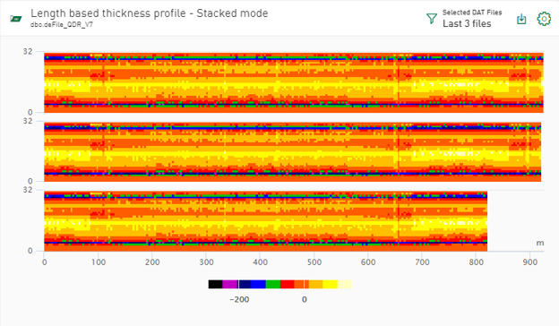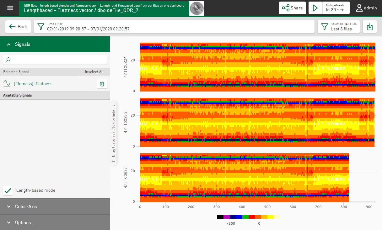 Signals from DAT files that are combined as a vector group can be visualized as a Heatmap. This is useful for signals from flatness or profile inspection systems. You can apply the Heatmap to time-based and length-based vectors.