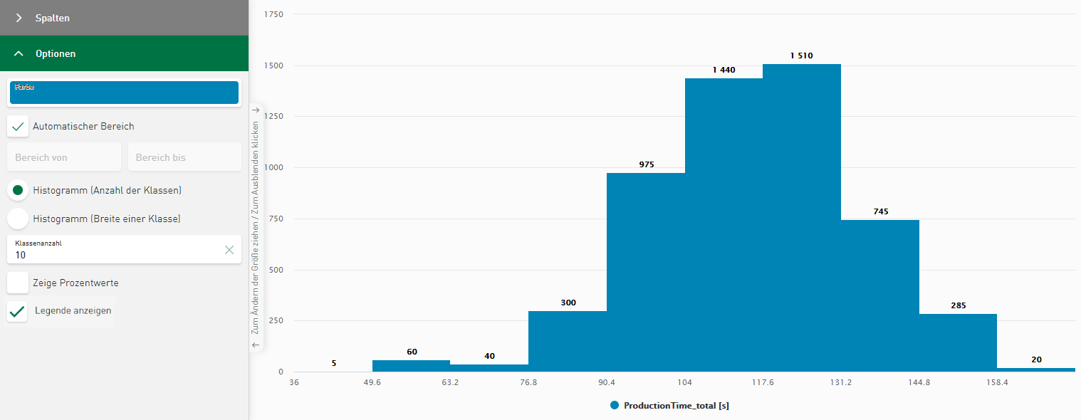 Die Häufigkeit einer Klasse wird direkt über der Säule angezeigt. Sie können die Angabe von absoluten Werten auf Prozentwerte umstellen.