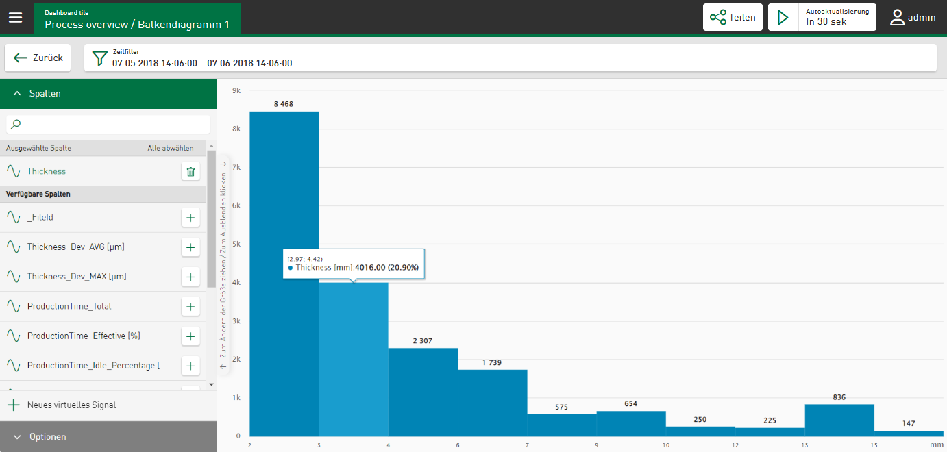 Sie können die Einteilung auch anhand der Breite einer Klasse vornehmen. Geben Sie dazu die gewünschte Breite in das Feld Klassenbreite ein. Die Klassenanzahl (Anzahl der angezeigten Balken) ergibt sich aus der Klassenbreite und dem Wertebereich der aktuell gesammelten Daten.