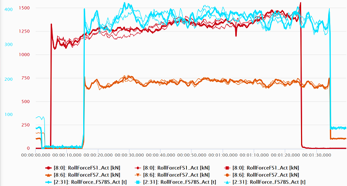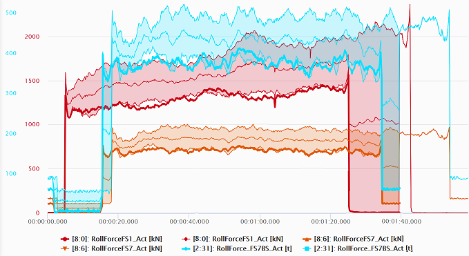 The display is suitable for comparing many measurement signals from different data files, the display is reduced to a flat representation. The maximum, minimum and average values can be read directly. Deviations in repetitive process sequences become immediately apparent. |