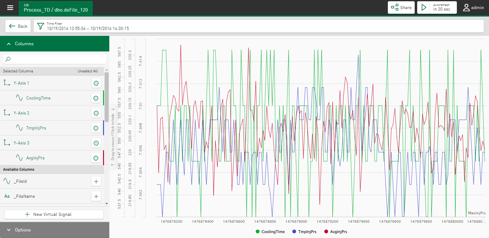 In the line chart, the signals or characteristic values are displayed as a trend over time. This makes it possible, for example, to identify parameter trends or interruption times.