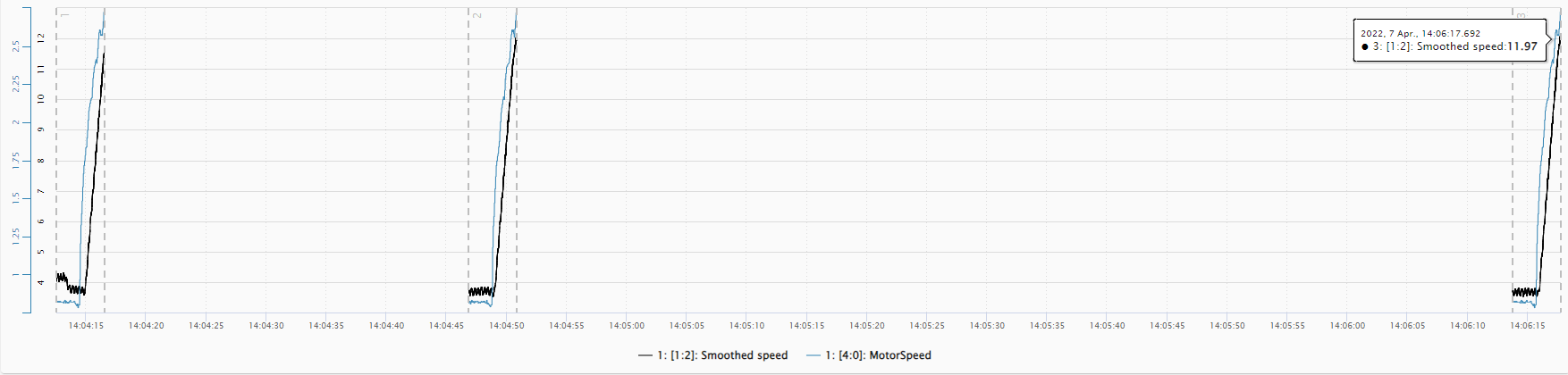 The signals are displayed according to the file start time and measurement signal duration; the start of a new file is visualized by interrupting the measurement signal curve.