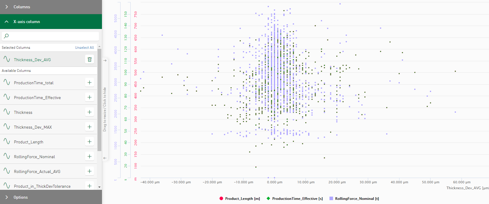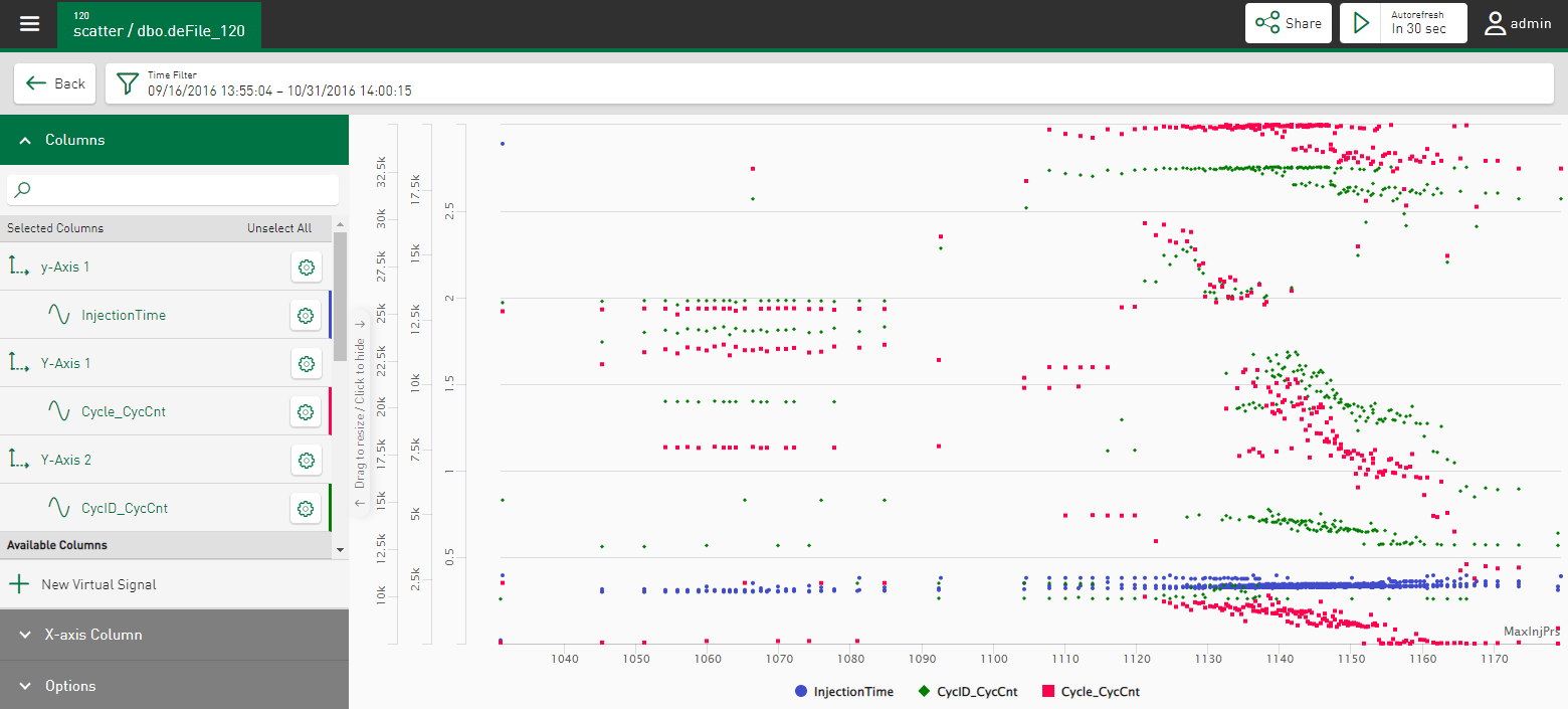 In the Columns section, select the signals that are to be shown in the scatter chart. The signals are shown in the chart first as points in relation to the time axis.