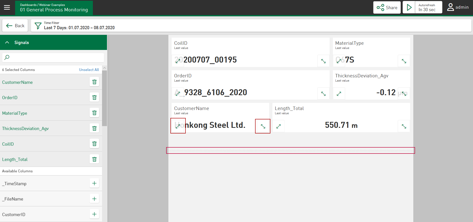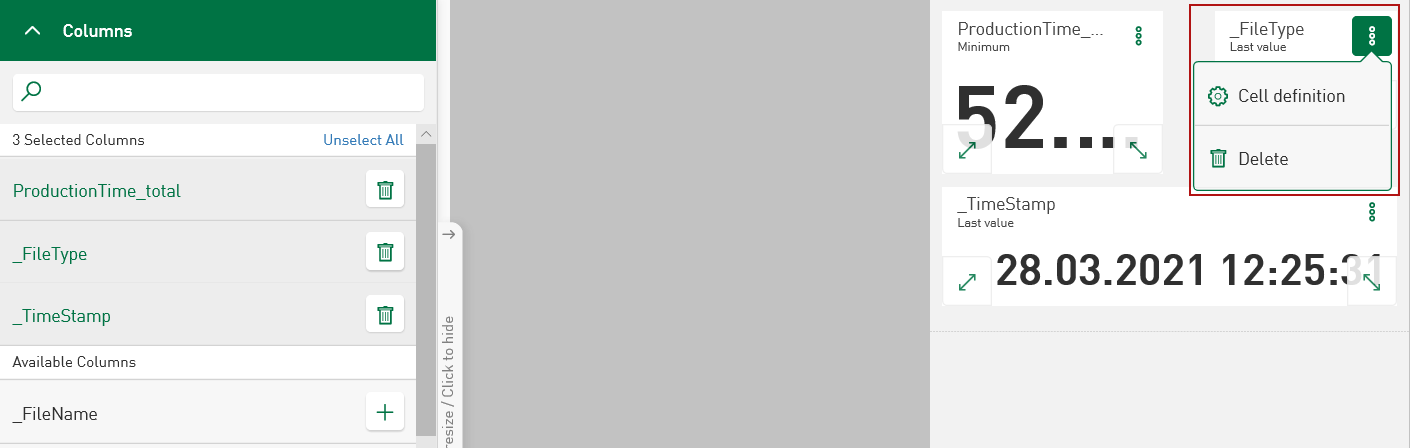 If you have selected columns for display, they automatically appear in the visible area of the tile. The width of the area in which the cell can be positioned corresponds to the width of the value display on the dashboard. The current tile height is marked by the dotted line in the editing area, but is not limited.