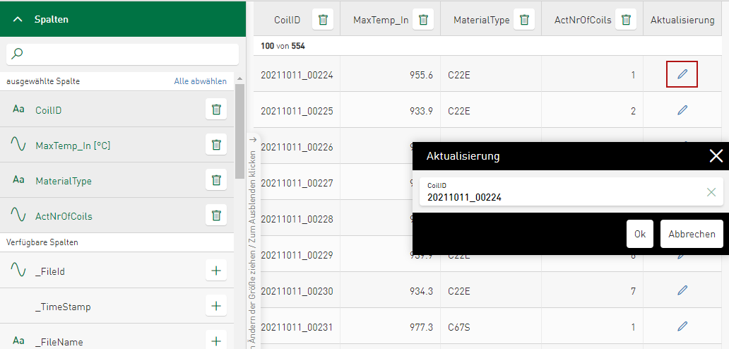 Wenn der aktuell angemeldete Nutzer oder die Benutzergruppe berechtigt ist, Datenquellen zu bearbeiten, können Tabelleninhalte satzweise geändert und Datenbanktabellen aktualisiert werden.
