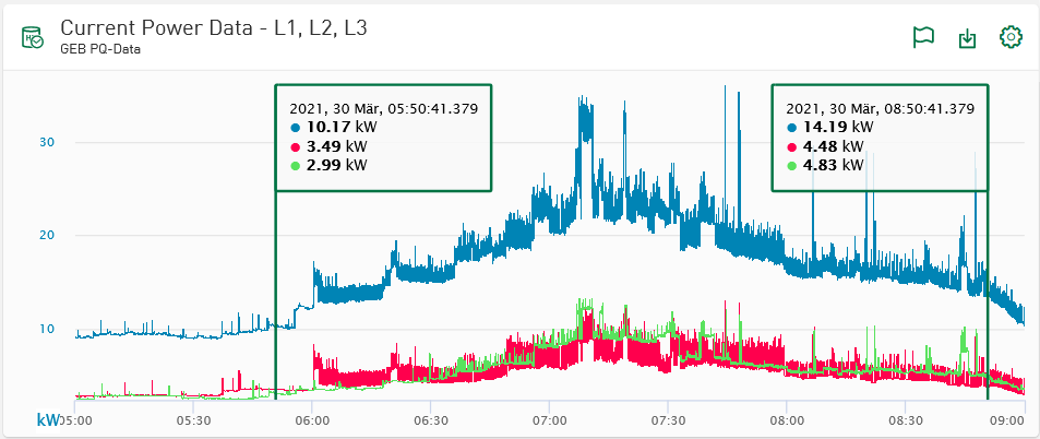 In Diagrams (e.g.line charts) showing signals from time-based or event-based stores and allowing interaction with ibaAnalyzer, you can display markers and place them freely.. For further analysis, you can transfer the time range between the markers directly into ibaAnalyzer.