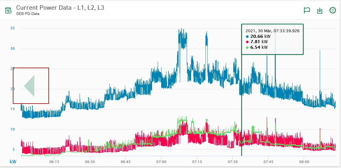 The markers remain at the selected position when zooming until they are hidden. If a marker is placed outside the currently displayed time range, a transparent arrow indicates the direction in which the marker is positioned.