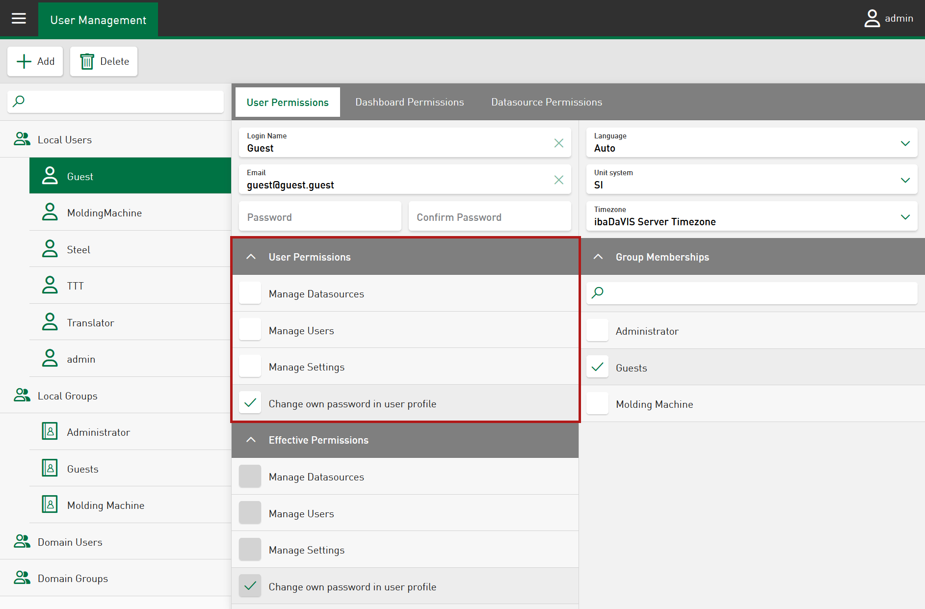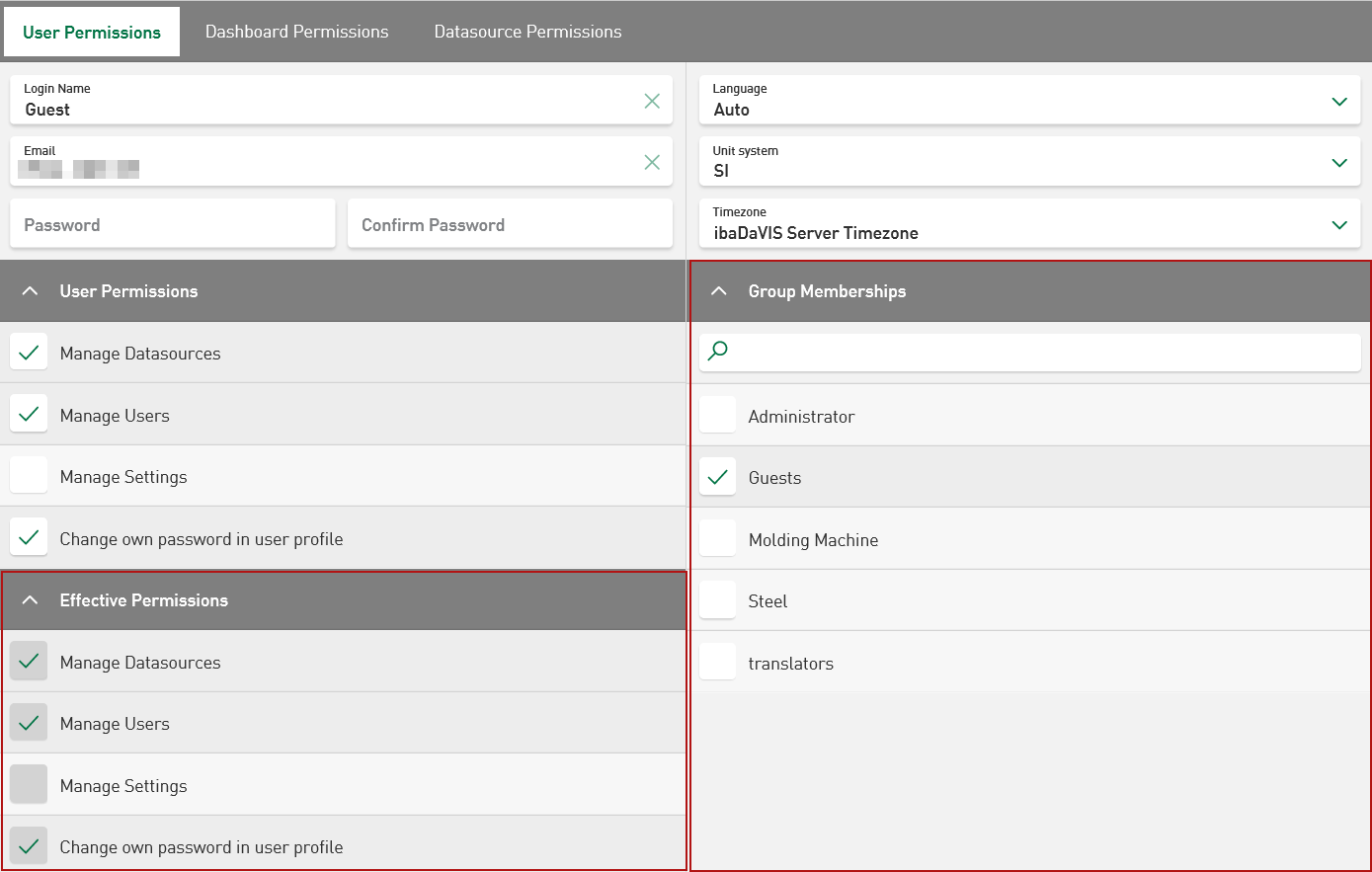 The rights from user permissions and group permissions that apply to the currently selected user are displayed as Effective Permissions. These are the actual permissions that have been assigned to a user.